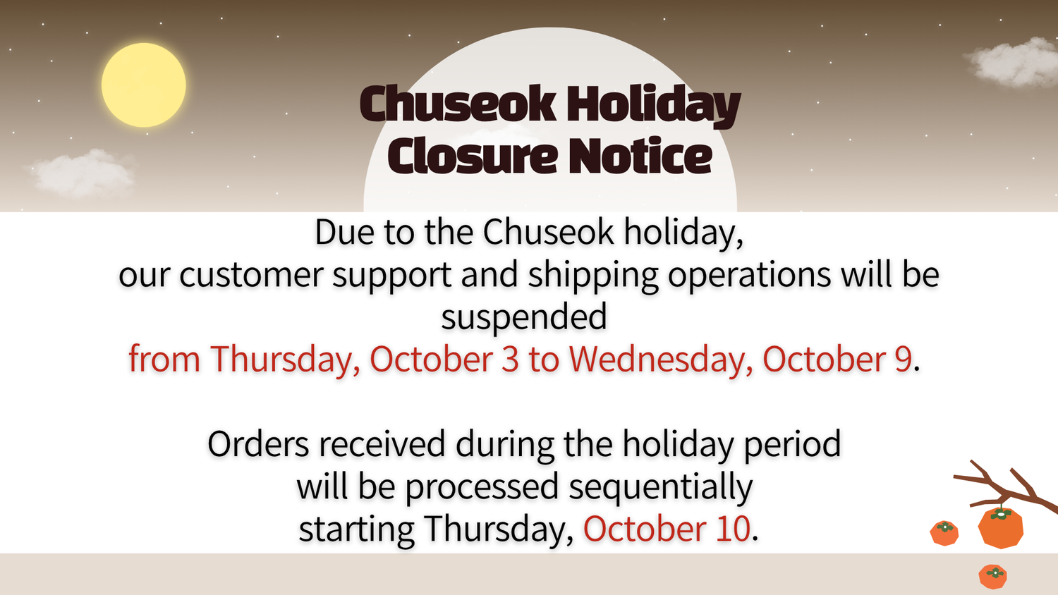Due to the Chuseok holiday, our customer support and shipping operations will be suspended from Thursday, October 3 to Wednesday, October 9.