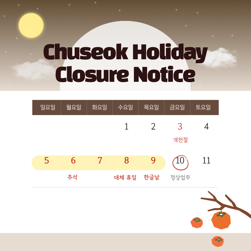 Due to the Chuseok holiday, our customer support and shipping operations will be suspended from Thursday, October 3 to Wednesday, October 9.