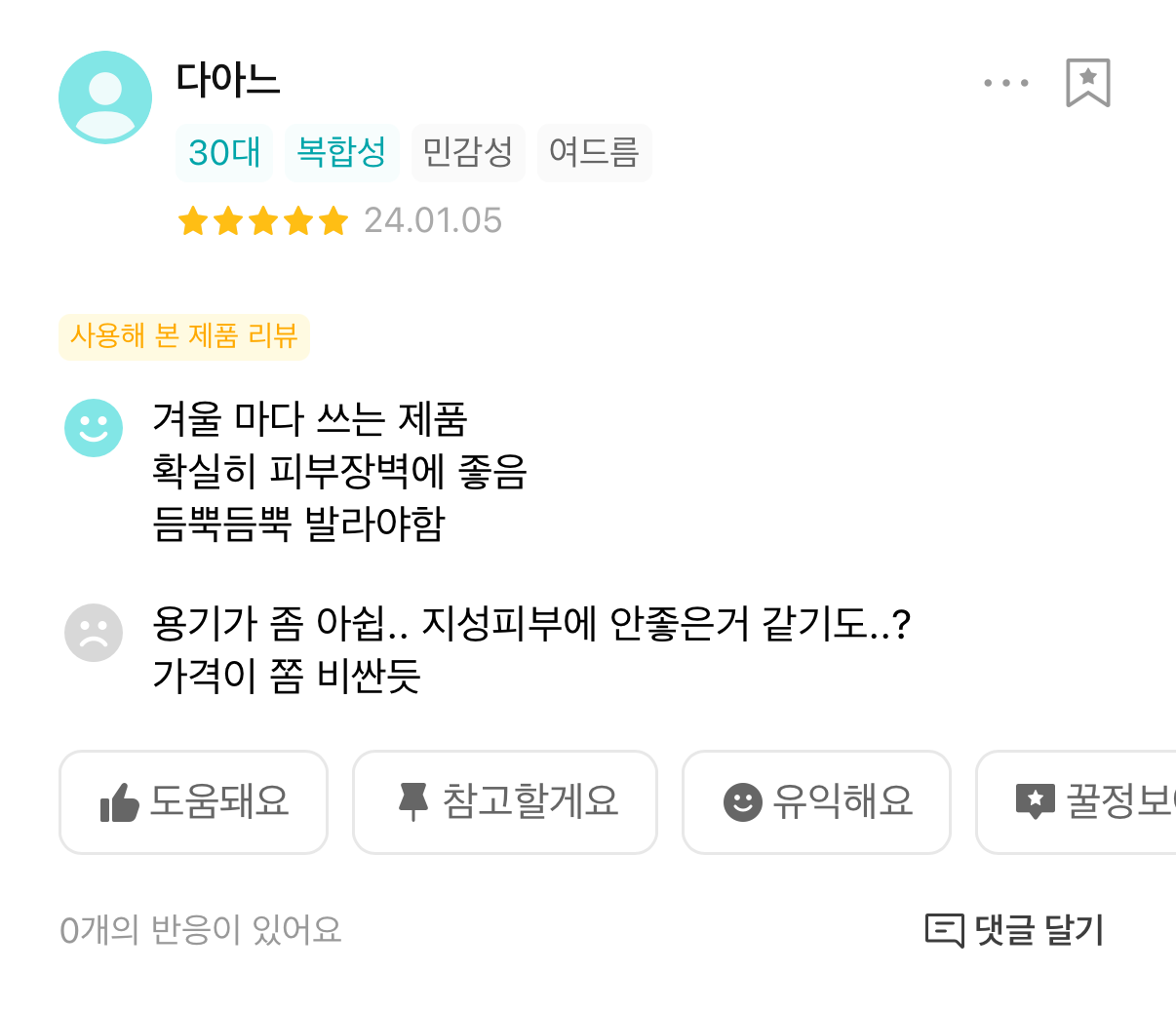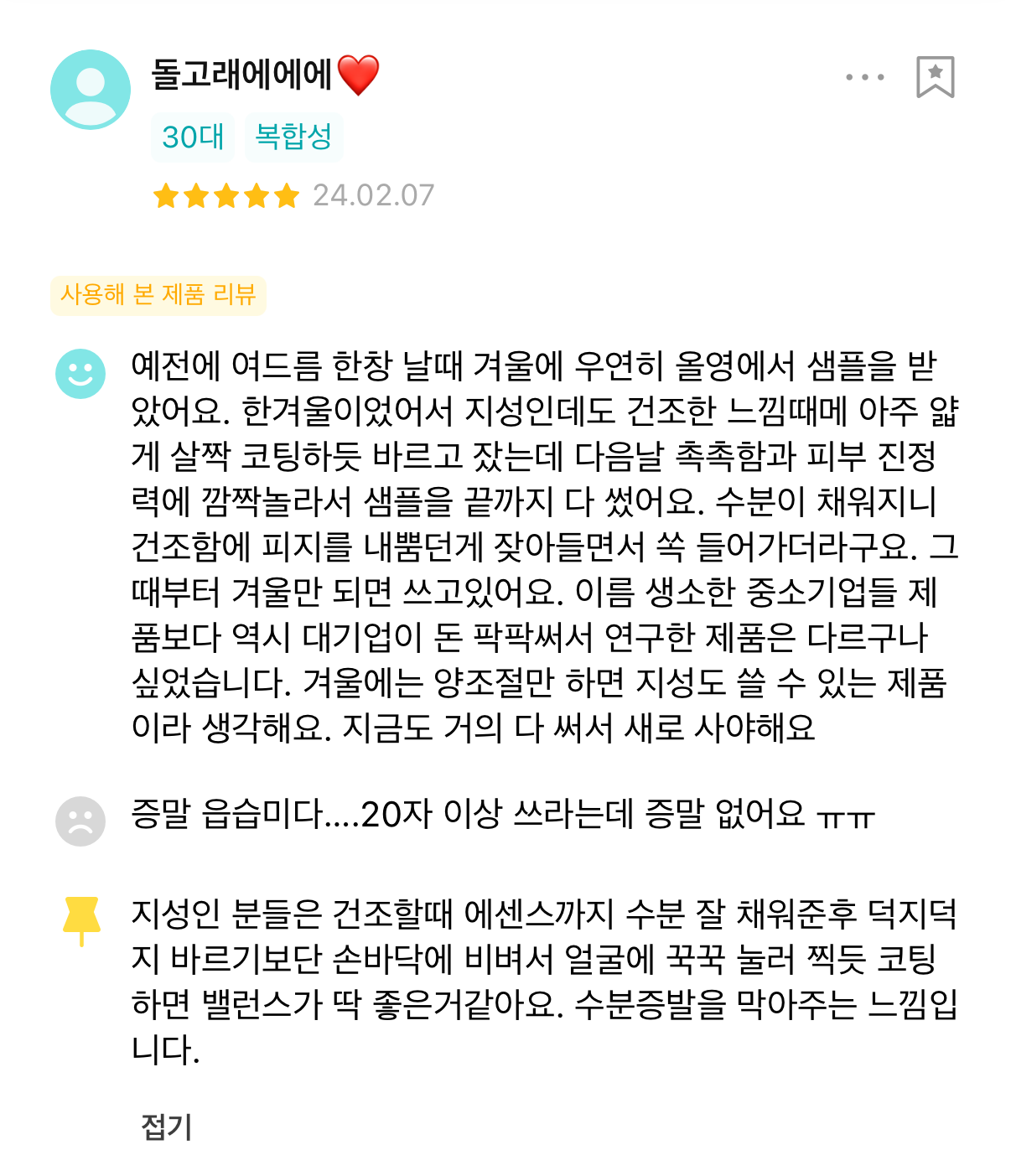 Back when my acne was really bad, I happened to receive a sample at Olive Young during the winter. It was the middle of winter, so even though I have oily skin, it felt dry. I applied a very thin layer, like lightly coating my skin, and went to sleep, and the next day I was surprised by the moisture and how well it calmed my skin, so I used up the sample to the very end. Once the moisture was filled, the sebum that had been coming out because of dryness calmed down and completely went away. Since then, I have been using it every winter. Compared to products from small and medium-sized brands with unfamiliar names, I felt that a product researched by a big company that spends a lot of money is really different. I think in winter, as long as you control the amount, it is a product that even people with oily skin can use. I have almost finished it now as well, so I need to buy a new one.