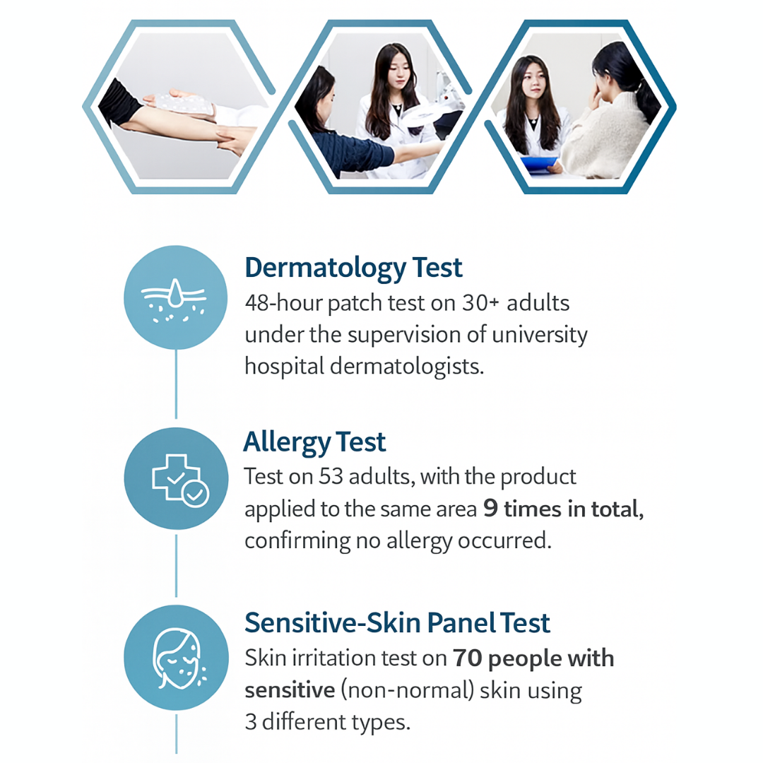 • Sensitive Panel Test: 3 types of skin irritation tests on 70 people with sensitive skin.