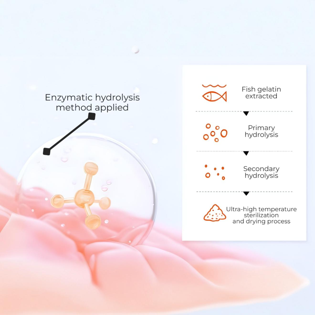 • Low-molecular fish collagen (average molecular weight 1,000 Da): Fish collagen is broken into tiny particles using two enzyme hydrolysis processes for better absorption.