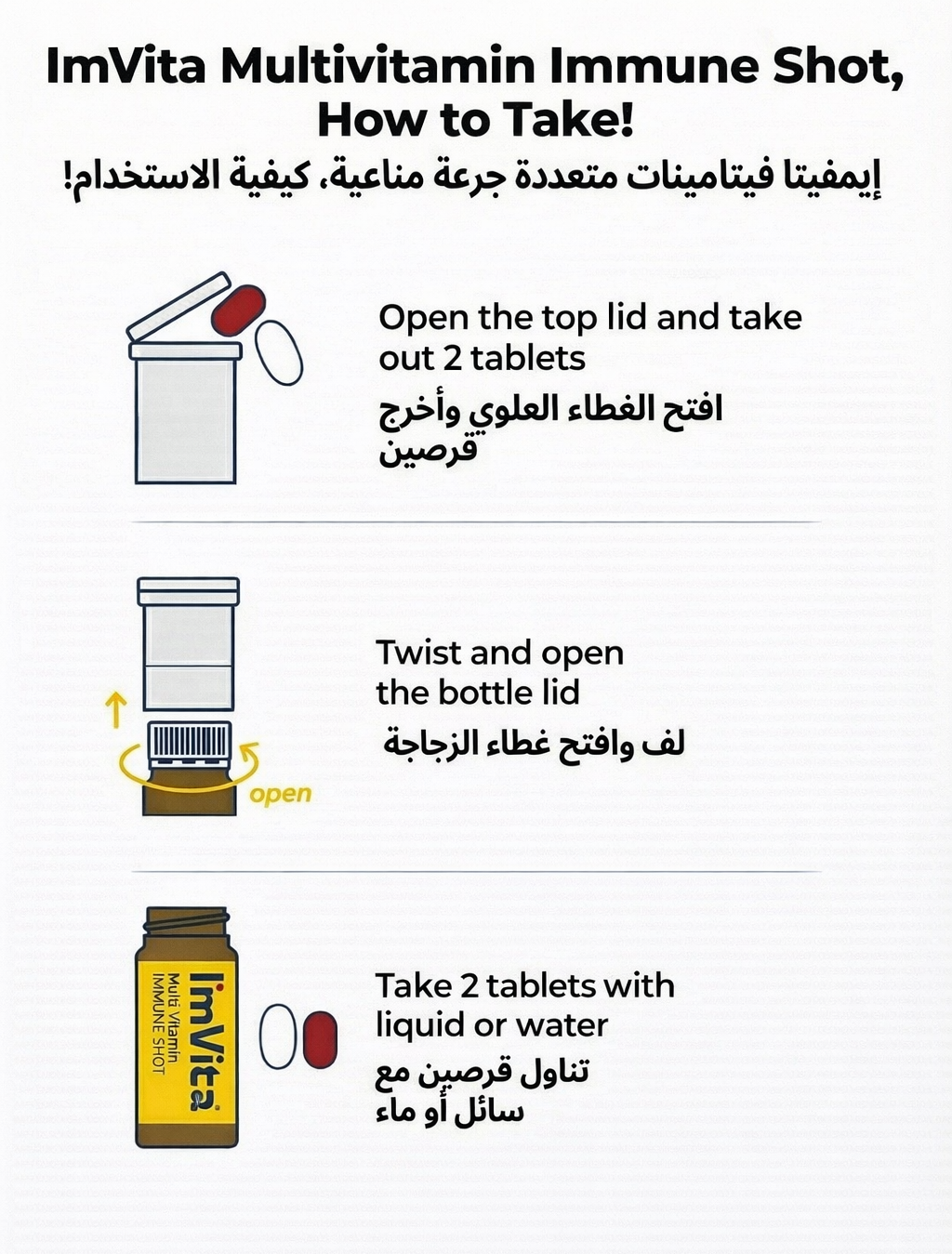 (Liquid) zinc gluconate, manganese sulfate, potassium iodide, purified water, red grapefruit concentrate 1, red grapefruit concentrate 2, oligosaccharides, cyclodextrin syrup, modified starch, flavoring (mixed fruit flavor), flavoring (grapefruit flavor), anhydrous citric acid, flavoring (citrus flavor), compound Scutellaria baicalensis extract blend, steviol glycosides, mixed herbal extract; (Tablet 1/white) premix (vitamin B12, maltodextrin, trisodium citrate, citric acid), vitamin C, pyridoxine hydrochloride, thiamine hydrochloride, riboflavin, calcium pantothenate, microcrystalline cellulose, coating premix [hydroxypropyl methylcellulose, titanium dioxide (colorant), triacetin], magnesium stearate, calcium carboxymethylcellulose, hydroxypropyl methylcellulose, premix (sodium carboxymethylcellulose, maltodextrin, glucose, lecithin, trisodium citrate), premix (L-leucine, L-valine, L-isoleucine), fermented fruit & vegetable blend powder, glycerin; (Tablet 2/red) dried yeast (containing selenium), premix (dl-alpha-tocopheryl acetate, glucose syrup powder, modified starch, silicon dioxide), premix [beta-carotene, modified starch, corn starch, glucose syrup powder, sodium ascorbate, vitamin E (dl-alpha-tocopherol)], dried yeast (containing chromium), dried yeast (containing molybdenum), copper gluconate, premix (vitamin D3, sucrose, gum arabic, corn starch, processed fat, silicon dioxide, vitamin E), premix (vitamin K1, gum arabic, sucrose), biotin, microcrystalline cellulose, hydroxypropyl methylcellulose, calcium carboxymethylcellulose, coating premix [hydroxypropyl methylcellulose, titanium dioxide (colorant), triacetin], magnesium stearate, silicon dioxide, glycerin, premix (sodium carboxymethylcellulose, maltodextrin, glucose, lecithin, trisodium citrate), cocoa colorant, colorant (FD&C Red No. 40 aluminum lake, FD&C Red No. 40); contains tomato, wheat, peach, soybean.