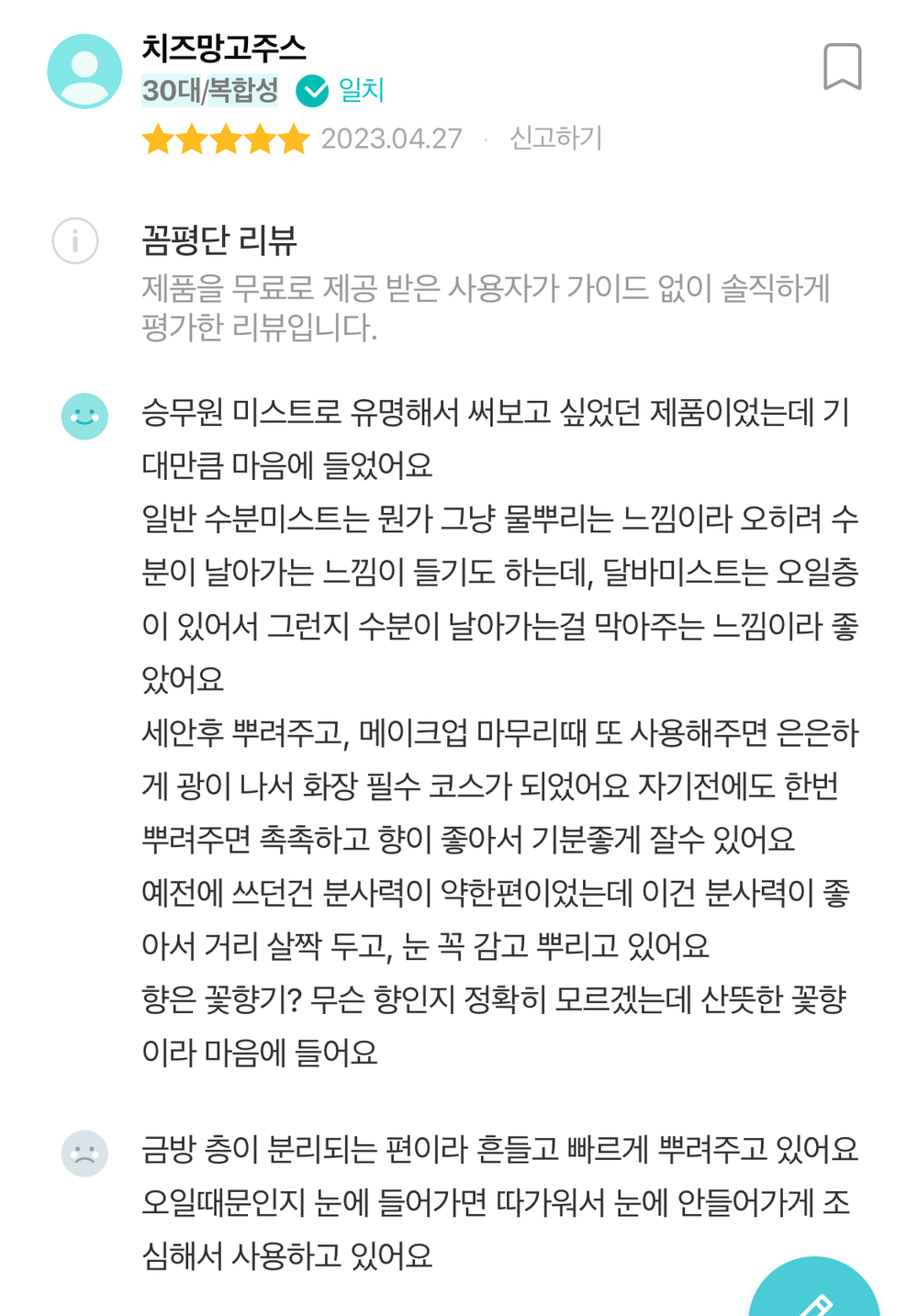 I wanted to try this product because it’s famous as a cabin crew mist, and it met my expectations. Regular hydration mists feel like just spraying water, and sometimes it even feels like the moisture evaporates. However, the d'Alba mist has an oil layer, which seems to prevent the moisture from escaping, and I really liked that.