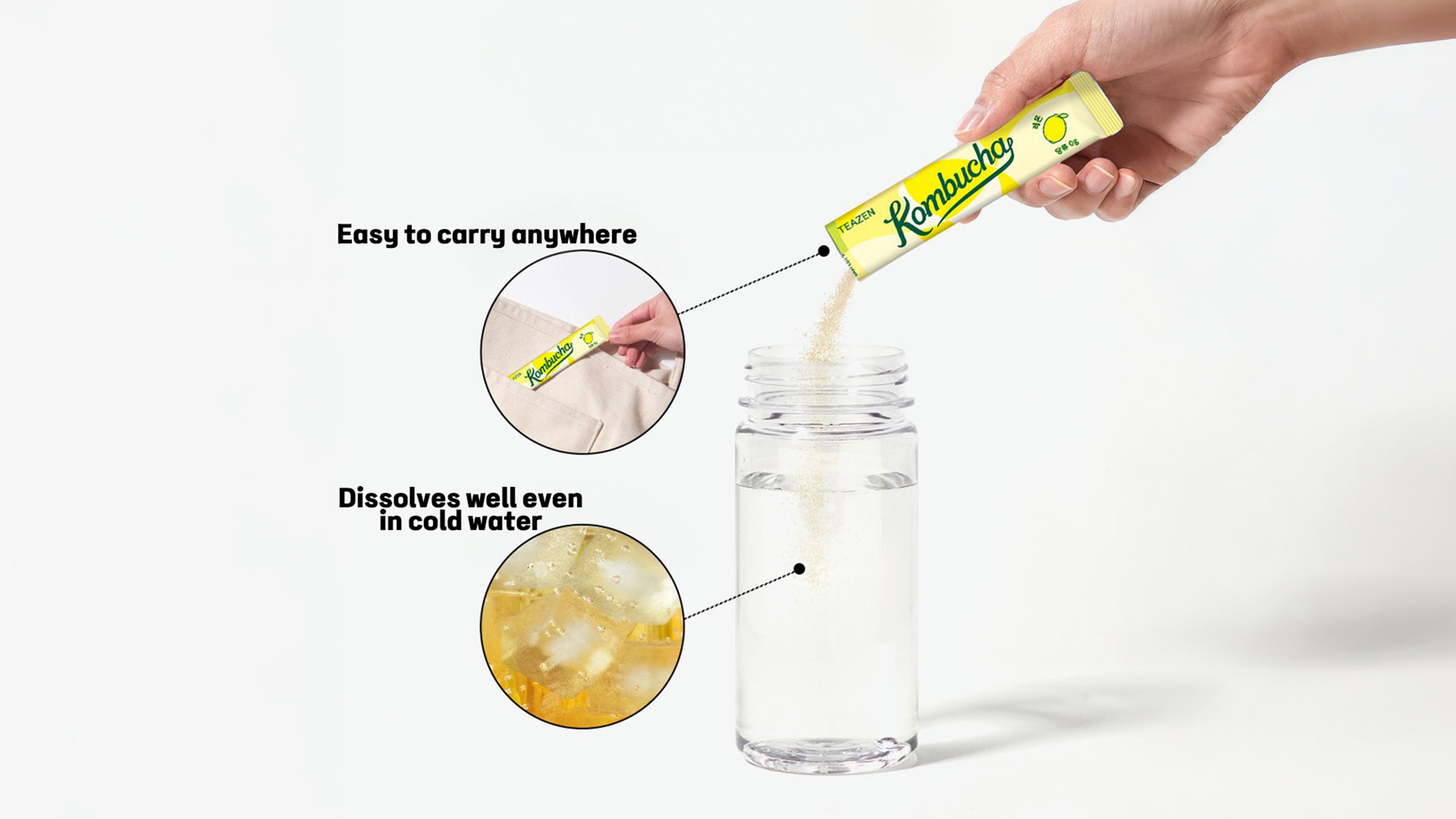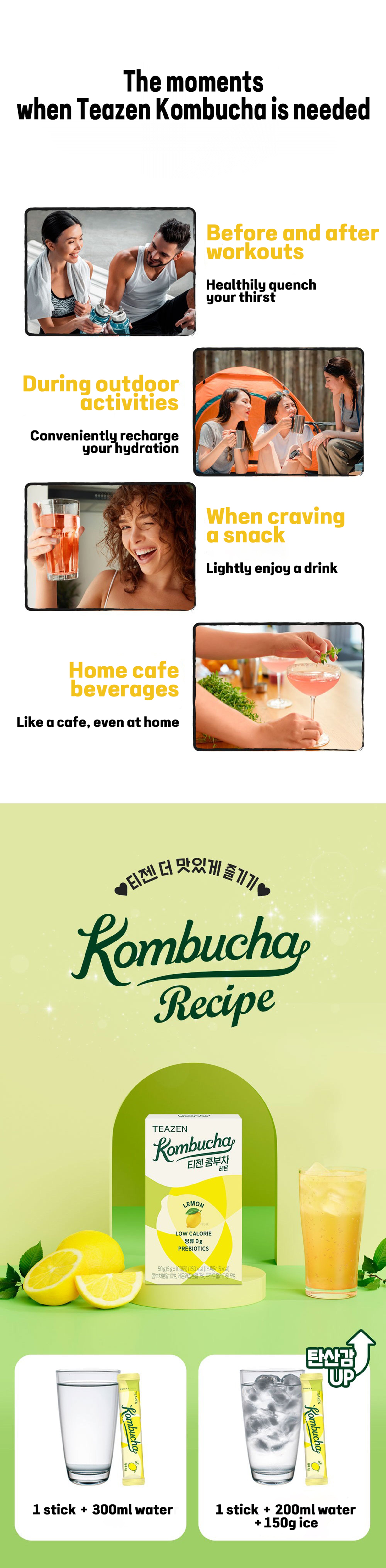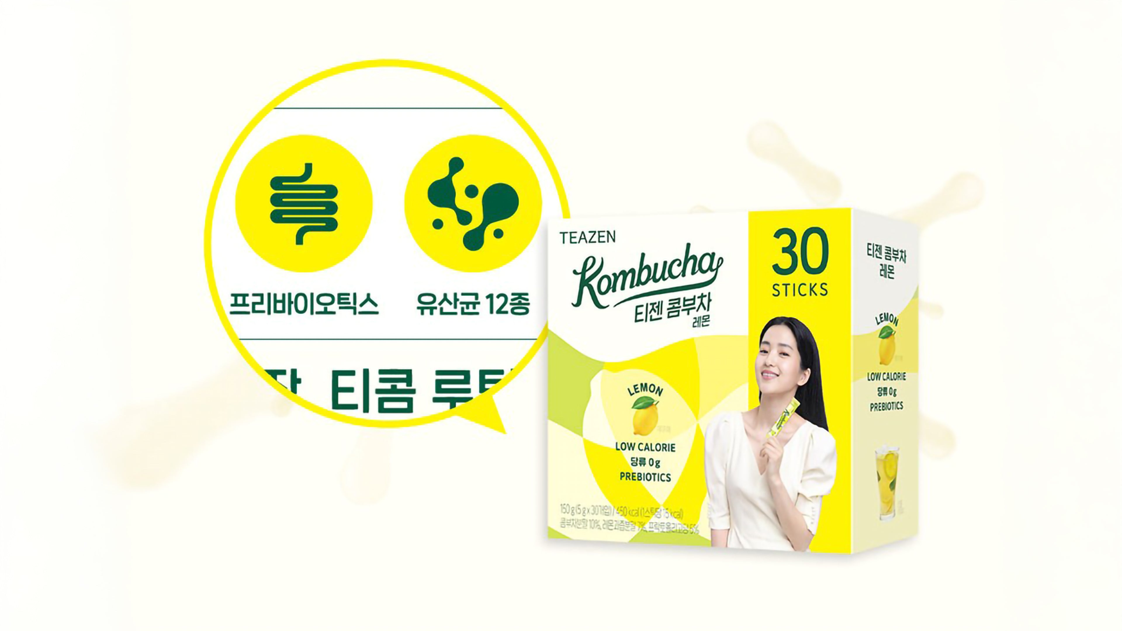 Citric acid, Fiberest, erythritol, sodium bicarbonate, kombucha powder 10% (Korea / Teazen Signature kombucha fermented liquid 75%, dextrin), peach juice powder 6% [dextrin, peach juice concentrate 20% (peach 100%, Korea)], fructooligosaccharide 5%, flavoring, hibiscus extract powder [hibiscus concentrate (hibiscus (origin: Nigeria), solids 20%) 92%, dextrin], black tea extract powder, sucralose (sweetener), mixed powder of 12 lactic acid bacteria strains, contains milk, soybean, peach.